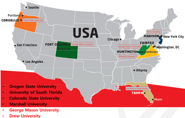 INTO OSU’s Trips & Activities .................................................................................................................................................. CSU-Colorado State University 글로벌전형 패스웨이 Fort Collins, Colorado 콜로라도주 록키산맥 기슭에있는 활기차고 친절한도시 편리한 대중교통과 자전거 전용도로, 산책로가잘갖춰짐 낮은 범죄율, 깨끗한 물과공기, 다양한 레크리에이션, 저렴한 생활비등으로 미국내 가장살기 좋은도시 연중37cm의 강수량으로 온화한기후분포에 연중300일이상이 화창한 날씨지속 세계 최고의 스키리조트로의 접근이용이 .................................................................................................................................................. USF-University Of South Florida 글로벌전형 패스웨이 Tampa, Florida 자연환경과 멋진 도심생활을 동시에 만끽 평균기온28도로 연중300일이상의 화창한날씨 박물관, 극장, 갤러리등에서문화체험을, 놀이공원과 해변에서 다양한 레크레이션을 즐김 자동차로 90분거리에 유니버셜스튜디오, 디즈니월드등 10개의 테마파크 미국내 70개 주요도시와 캐나다, 쿠바, 영국등의 직항노선으로 이동이용이 학생지원서비스 Interest Group Programme(I.G.P) •화, 목요일/ 주당3시간 수업 •GE / AE / Pathway 학생대상 •Clubs ; 저널리즘, 스포츠, 사진클럽, 문화/예술 •Domestic student leaders –교내 공고및 광고하여 뽑음 INTO USF Tutoring Centre •INTO의 학생들에게 무료 지원되는 튜터서비스 •온라인으로 사전에 예약을 하거나 시간표를 보고 원하는 시간에 방문하여 이용 •영어, 미국문화, 시험대비등을 공부 Florida 주 Tampa-University of South Florida 캠퍼스 .................................................................................................................................................. MU-Marshall University 글로벌전형 패스웨이 Huntington, West Virginia 작고안전한도시/친절한지역 주민들과 저렴한물가 사계절이 뚜렷-1월 평균5도/ 7월은 25도 .................................................................................................................................................. GMU-George Mason University 글로벌전형 패스웨이 Fairfax, Virginia Virginia주 Fairfax-George Mason University 캠퍼스 .................................................................................................................................................. Drew-New York At Drew University 글로벌전형 패스웨이 Madison, New Jersey •인구16,000 명 •부촌–낮은 범죄율 •뉴욕까지 기차로 47분 Newark-Liberty International Airport 까지20분 Boston 과Washington, D.C. 까지 4-5시간 New Jersey주 Madison Drew University 캠퍼스 |